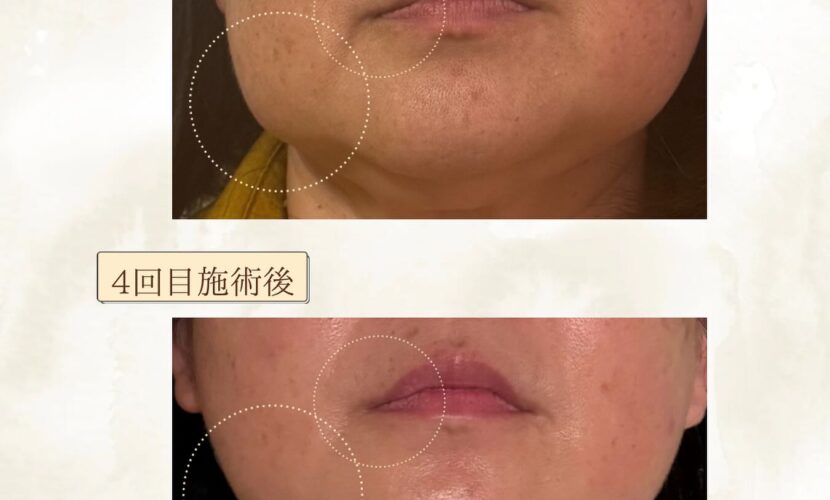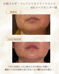 施術前はほうれい線、フェイスラインのもたつき、お肌のたるみが気になられてましたが、4回目終了後にはフェイスラインがくっきりとし、左側は盛り上がりが少なくなっています!下がり気味だった口角も上がりお口がまっすぐになりました!ここまでは小顔コルギの効果です💚